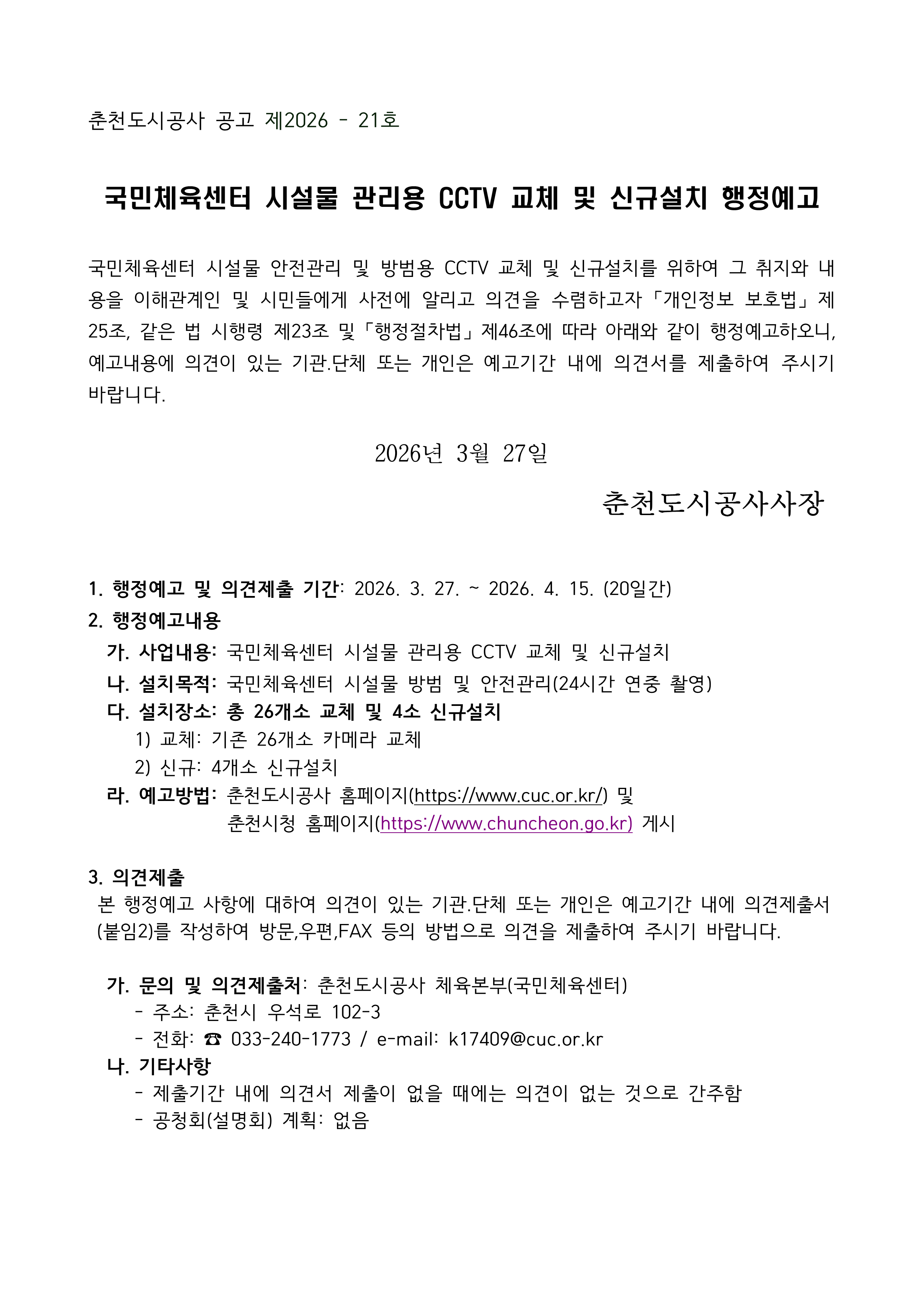 1. 국민체육센터 시설물 관리용 CCTV 교체 및 신규설치 행정예고 공고문.hwp