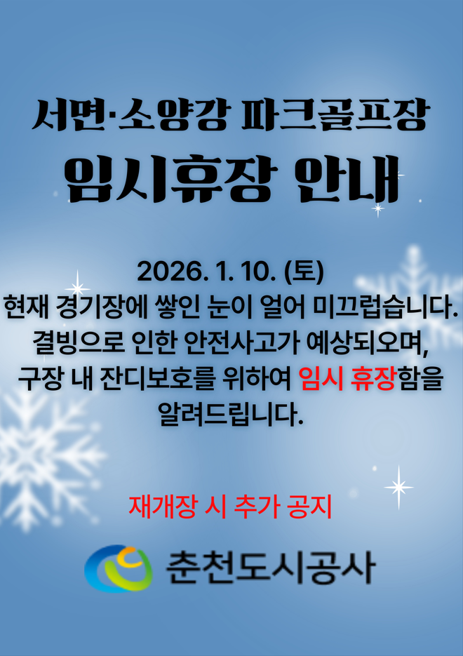 서면·소양강 파크골프장 폭설로 인한 임시휴장 안내