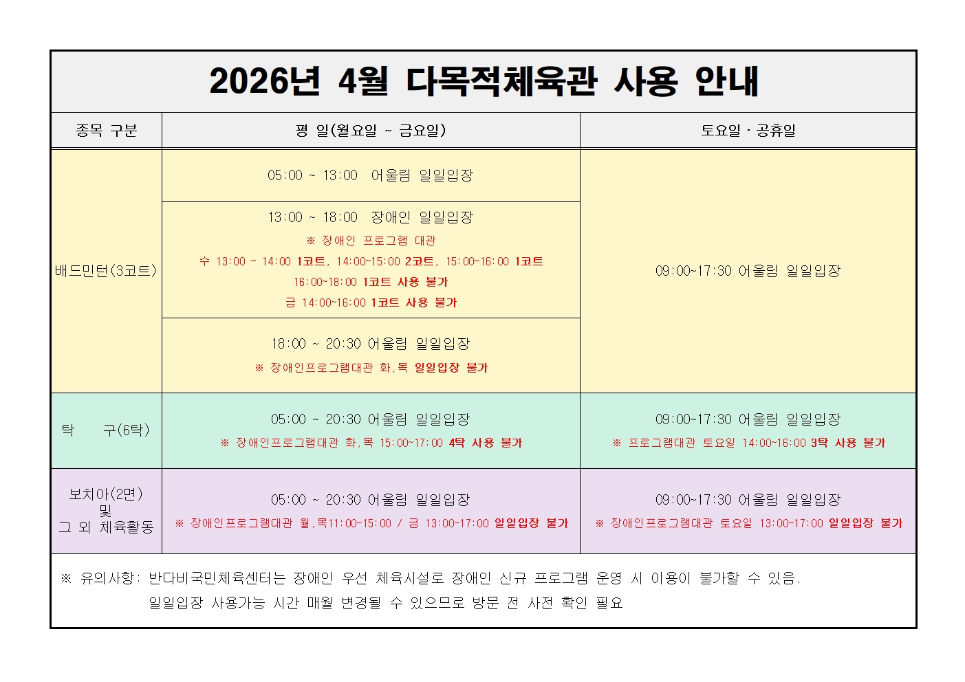 [반다비국민체육센터] 2026년 4월 다목적체육관 사용 안내