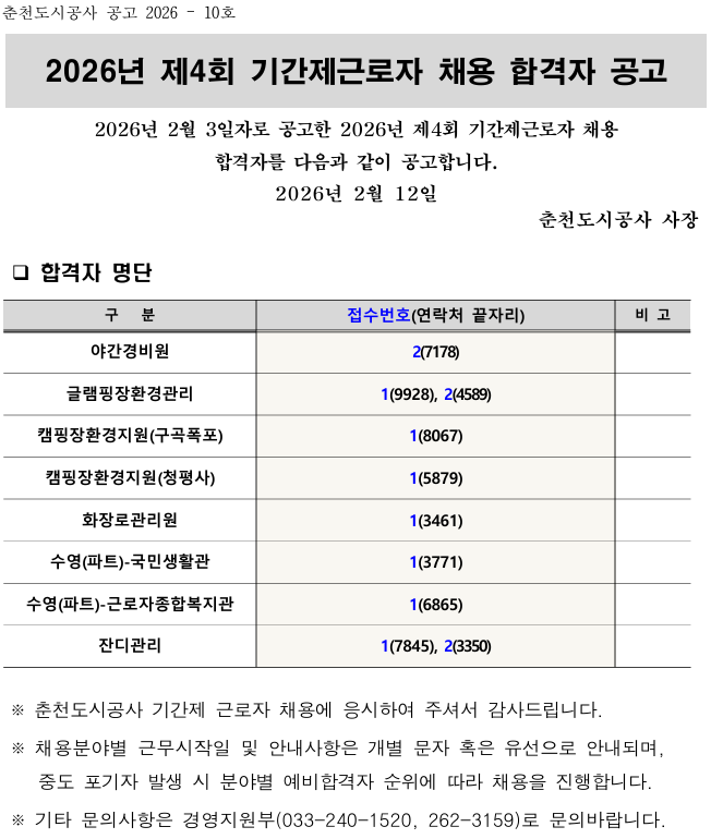 2026년 제4회 기간제근로자 채용 합격자 공고