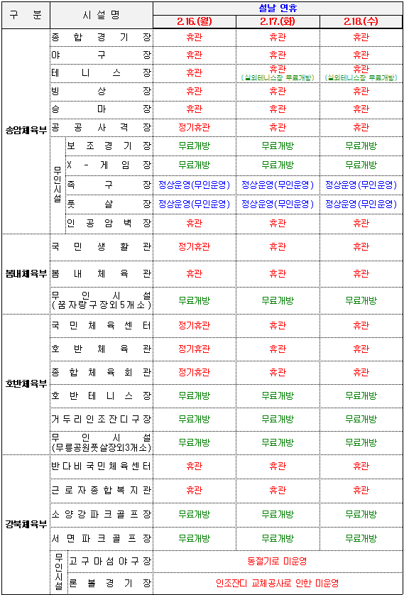 2026년 2월 16일 ~ 2월 18일 설 연휴기간 시설 운영현황을